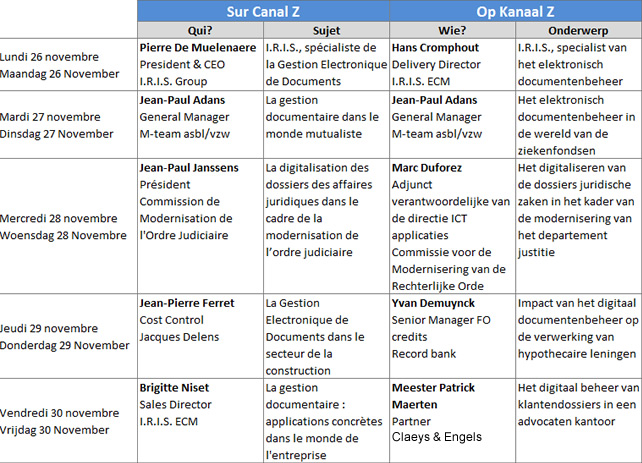I.R.I.S. maakt met u een afspraak op Kanaal Z / Canal Z, een Belgische zender, toegespitst op economische berichtgeving. Vanaf maandag wordt dagelijks een reeks interviews uitgezonden over Information Management.